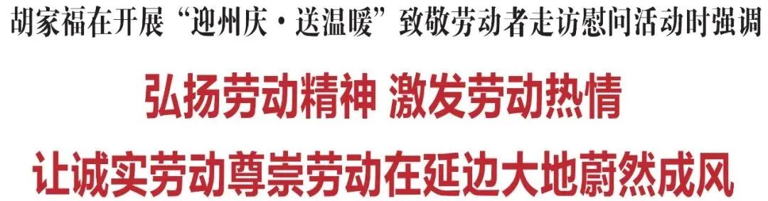 走访慰问中,胡家福指出,光荣属于劳动者,幸福也应该属于劳动者。要在全州上下大力弘扬劳动最光荣、劳动最崇高、劳动最伟大、劳动最美丽的理念,进一步焕发劳动热情、释放创造潜能,让诚实劳动尊崇劳动在延边大地蔚然成风。各级党委、政府要关心关爱广大劳动者,着力解决职工群众牵肠挂肚、急难愁盼的问题,坚决维护职工群众合法权益,使广大职工群众获得感成色更足、幸福感更可持续、安全感更有保障。