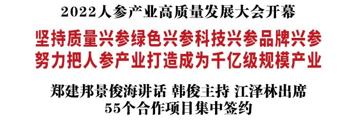9月20日,2022人参产业高质量发展大会开幕。全国政协副主席、民革中央常务副主席郑建邦,省委书记景俊海出席开幕式并讲话。省委副书记、省长韩俊主持开幕式。省政协主席江泽林出席。开幕式分别在长春市和白山市抚松县设会场。55个合作项目集中签约,计划总投资543.6亿元。