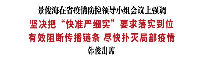 今天,省委书记景俊海在北京以视频形式主持召开省疫情防控领导小组会议。他强调,要深入贯彻习近平总书记关于高效统筹疫情防控和经济社会发展重要讲话重要指示精神,坚持人民至上、生命至上,始终保持“时时放心不下”的责任感,坚决把“快准严细实”要求落实到位,有效阻断传播链条,尽快扑灭局部疫情,坚决守住不发生疫情规模性反弹底线,为党的二十大胜利召开营造良好环境。省委副书记、省长韩俊出席会议并作重点点评。