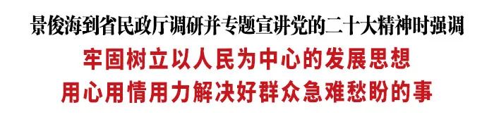 11月2日,省委书记景俊海到省民政厅调研并专题宣讲党的二十大精神。他强调,要学深悟透习近平新时代中国特色社会主义思想,全面贯彻党的二十大精神,牢固树立以人民为中心的发展思想,用心用情用力解决好群众急难愁盼的事,切实实现好、维护好、发展好广大人民最根本利益。