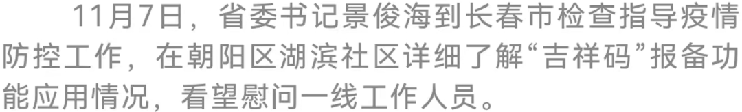 11月7日,省委书记景俊海在长春市检查指导疫情防控工作。他强调,要深入贯彻习近平总书记关于高效统筹疫情防控和经济社会发展的重要讲话重要指示精神,坚持人民至上、生命至上,坚持防输入、控反弹,压紧压实“四方责任”,严格按照“四早”和“四应四尽”要求,精准落细落实防控措施,有效防止疫情输入扩散,切实保障人民群众生命安全和身体健康。