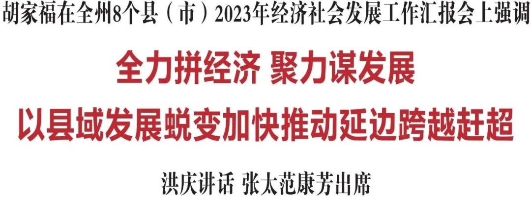胡家福强调,今年经济工作千头万绪,各县(市)要聚焦全州工作大局和目标要求,从改善社会心理预期、提振发展信心入手,纲举目张做好工作。要在项目建设上力求新突破,坚持“项目为王”理念,把项目建设摆在更加突出的位置,充分发挥重大项目建设专班作用,扎实做好项目资金、用地、用工、用材等要素保障服务,做足做细做熟重大项目前期工作,加快推进在建续建项目,确保项目早建成、早投产、早见效,尽快形成大项目顶天立地、好项目铺天盖地的生动局面。要在产业集群上力求新进展,按照“沿链谋划、龙头牵引、培育壮大、集群发展”的思路,抢抓产业发展“窗口期”,勇于开辟新领域、制胜新赛道,着力打造医药、食品烟草、新能源、旅游、医美、纺织服装、光电子、优质矿泉水、动漫等产业集群,进一步提升我州产业体系现代化水平。要在恢复和扩大消费上力求新成效,培育一批沉浸体验、网红打卡等消费场景,深挖夜经济、信息消费等方面潜力,聚焦住房、汽车、家电等领域开展系列促销活动,围绕重大节日组织形式多样的消费活动,精准投放吃住行游购娱全链条消费券,千方百计促进旅游回流,进一步激发消费活力。要在招商引资上力求新目标,紧盯发达地区产业梯度转移最新态势,深化与长三角、珠三角、环渤海区域的对接合作,采取以商招商、产业链招商、小分队招商等方式,引进一批头部企业和战略投资者,为长远发展注入强劲动力。要在优化营商环境上力求新进步,牢固树立“营商环境没有最好,只有更好”的理念,用活用好助企长效机制,落实落细各项惠企政策,对招商项目实行全周期管理服务,千方百计解决好企业发展、项目建设过程中遇到的困难和问题,努力使延边成为招商引资“磁场”、投资兴业“沃土”、企业发展“福地”。
