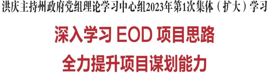 3月24日,州委副书记、州长洪庆主持州政府党组理论学习中心组2023年第1次集体学习,邀请中国环境科学研究院湖泊生态环境研究所副研究员付正辉博士、副研究员魏健博士,中国农业发展银行吉林省分行乡村振兴处副处长王冬,就EOD(生态环境导向的开发模式)项目申报、资金投向和中央预算内生态环境保护专项资金项目包装进行系统讲解。