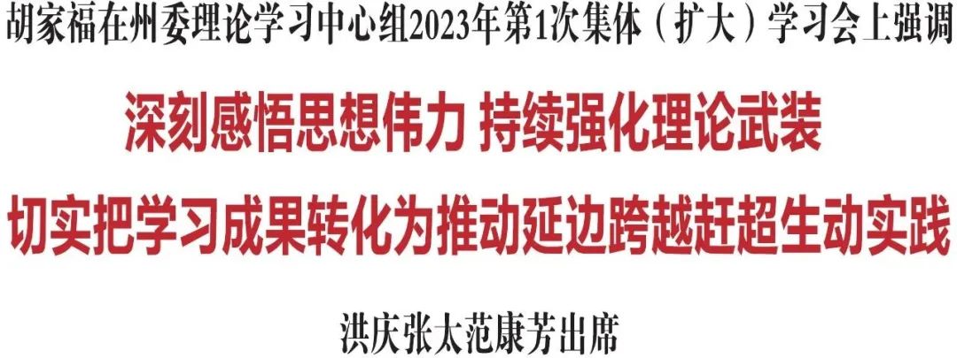 4月7日,省委常委、州委书记胡家福主持召开州委理论学习中心组2023年第1次集体(扩大)学习会。他强调,要以全党开展主题教育活动为契机,深入学习贯彻习近平新时代中国特色社会主义思想,深刻感悟思想伟力,持续强化理论武装,切实把学习成果转化为推动延边跨越赶超的生动实践。州委副书记、州长洪庆,州人大常委会主任张太范,州政协主席康芳出席会议。