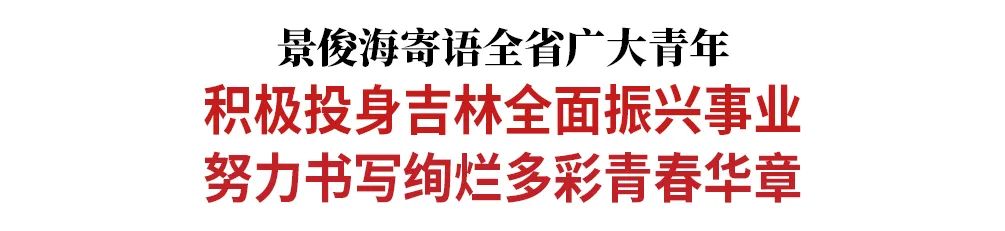 景俊海指出,当前,吉林全面振兴正处在关键期,广大青年施展才干的舞台无比广阔、实现梦想的前景无比光明。希望全省广大青年牢牢把握住实现抱负、施展才华的难得人生际遇,努力成长为有理想、敢担当、能吃苦、肯奋斗的新时代好青年,在加快推动吉林全面振兴中淬炼初心、增长才干、收获成功。要始终保持报效祖国的炽热情怀,把自己的理想同祖国的前途、把自己的人生同民族的命运紧密联系在一起,坚定不移听党话、跟党走,忠实践行习近平新时代中国特色社会主义思想,深刻领悟“两个确立”的决定性意义,增强“四个意识”、坚定“四个自信”、做到“两个维护”,让青春在全面建设社会主义现代化国家、实现中华民族伟大复兴中国梦的火热实践中绽放绚丽之花。要始终保持自强不息的意志品格,敢于到条件艰苦基层、经济建设一线、科技攻关前沿,去“摸爬滚打”、去“自找苦吃”,锤炼初生牛犊不怕虎、越是艰险越向前的刚健勇毅,努力做到面对困难挫折撑得住、关键时刻顶得住、风险挑战扛得住,真正成为走在时代前列的奋进者、开拓者、奉献者。要始终保持逐梦前行的奋斗激情,怀抱梦想又脚踏实地,敢想敢为又善作善成,在深入实施“一主六双”高质量发展战略、大力发展“六新产业”、加快建设“四新设施”等全省重点任务中找准定位、深度融入、创新创业,把理想变为现实,与吉林振兴同脉搏、同奋进、同收获。