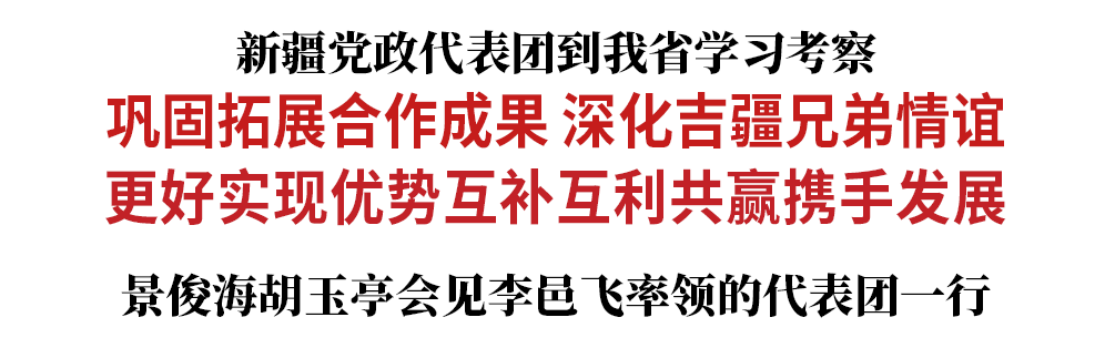 景俊海、胡玉亭向代表团一行到访表示热烈欢迎。景俊海说,这些年,新疆维吾尔自治区党委政府和新疆生产建设兵团坚持以习近平新时代中国特色社会主义思想为指引,深入贯彻新时代党的治疆方略,巩固和发展了天山南北稳定祥和、各族人民安居乐业的良好局面。新疆维吾尔自治区党委政府和新疆生产建设兵团的好经验好做法,值得我们认真学习。近年来,吉林省深入贯彻习近平总书记重要讲话重要指示精神,扎实推进对口援疆工作,为新疆各项事业发展提供了力所能及的帮助。下一步,我们将继续坚定不移贯彻落实习近平总书记重要讲话重要指示精神,坚决扛稳对口援疆重大政治责任,发扬“绝不相负”的吉林援疆精神,以更高站位推动强基固本,以更强担当做好产业帮扶,以更高标准保障改善民生,以更大决心强化智力支援,以更实举措促进交往交流交融,为实现新疆社会稳定和长治久安贡献吉林力量。希望两地持续巩固拓展合作成果,深化吉疆兄弟情谊,进一步加强农业、汽车、能源、医药、文旅等领域交流合作,共同推进高水平对外开放,更好实现优势互补、互利共赢、携手发展,齐心协力为推进中国式现代化作出更大贡献。