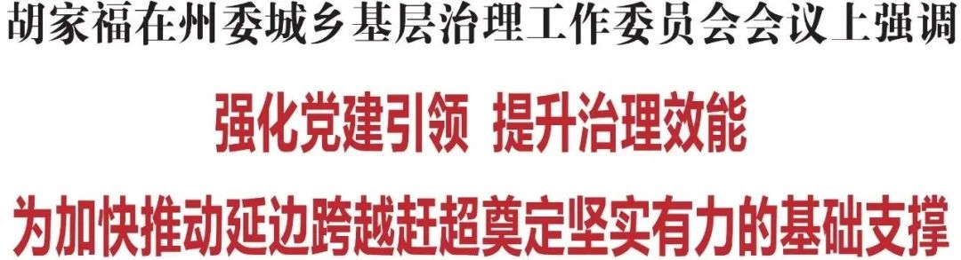 胡家福强调,党的十八大以来,以习近平同志为核心的党中央高度重视基层建设,习近平总书记就加强基层建设和基层治理工作作出一系列重要指示批示。2022年2月,省委启动“基层建设年”活动,为推动党建引领基层治理工作提出新要求、明确新任务。各县市各部门要紧扣党中央、省委部署要求,把基层治理放在全州大局中去思考、去谋划、去推进,持续夯实基层基础,不断激发治理活力,着力提升基层治理体系和治理能力现代化水平。一要突出党建引领、完善组织体系,加快构建共建共治共享基层治理格局。坚持把党的领导贯穿基层治理全过程、各方面,持续扩大对各类经济组织、社会组织的全覆盖,大力培育党组织领导下的服务性、公益性、互助性社会组织,创新社区与社会组织、社会工作者、社区志愿者的联动机制,加强党组织领导下的村(居)民委员会规范化建设,创建“有事来商量”特色协商品牌,引导群众在协商中凝聚共识、化解纠纷,努力建设人人有责、人人尽责、人人享有的基层治理共同体。二要夯实工作基础、健全制度机制,着力提升党建引领城乡基层治理效能。严格落实“四级包保”责任制,健全完善“双三长”、“双报到”等制度,持续抓好万名基层治理专干选育管用工作,扎实做好“延边e录通”升级改造、“一户一码”推行等工作,强化部门信息资源对接共享,健全应急管理组织体系、预警体系、反应体系和处置体系,常态化开展应急演练,有效提升处置重大突发事件的能力。三要坚持统筹推进、做好分类指导,不断推动基层治理专项工作取得实效。街道(乡镇)管理体制改革工作组要构建简约高效的基层管理体制,推动编制资源向基层倾斜;简政放权工作组要完善基层权责事项清单,持续为基层赋权减负;网格治理工作组要健全完善网格化服务管理工作体系和运行机制,切实做到“人到格中去、事在网中办、难在网中解”;物业治理工作组要大力提升物业行业党组织覆盖率,加快建设一批“红心物业”,探索推行“红黑榜”制度,着力提高专业化服务管理水平;民生服务工作组要持续深化“新时代新社区新生活”服务质量提升活动和“我为群众办实事”实践活动,不断提升群众的满意度和获得感。四要聚焦薄弱环节、补齐工作短板,坚决完成基层治理巡视反馈问题整改。针对省委基层治理专项巡视反馈问题,逐个进行梳理、找准问题症结、拿出有力措施、狠抓问题整改,把行之有效的整改措施以制度机制的方式固定下来,对整改工作消极应付、推卸责任、整改不力、不能如期完成任务的采取“责任倒查”,确保所有问题改彻底、改到位。五要压实主体责任、凝聚工作合力,切实保障基层治理各项任务落地落实。州委城乡基层治理工作委员会要统筹研究部署城乡基层治理全州性重大改革任务,推出更多强基层、促治理、惠民生的政策举措。委员会办公室要抓好统筹协调,推动形成部门协同、上下联动的工作格局。各专项工作组及成员单位要立足职能、服务全局,着力加强业务指导,研究破解突出问题。各县市党委、政府要加强对基层治理工作的组织领导、统筹实施、考核评价、督促检查,及时帮助基层解决困难问题。城乡基层党组织要紧密结合实际创造性开展工作,积极探索更多可复制可推广的经验做法,以治理创新带动自身发展。