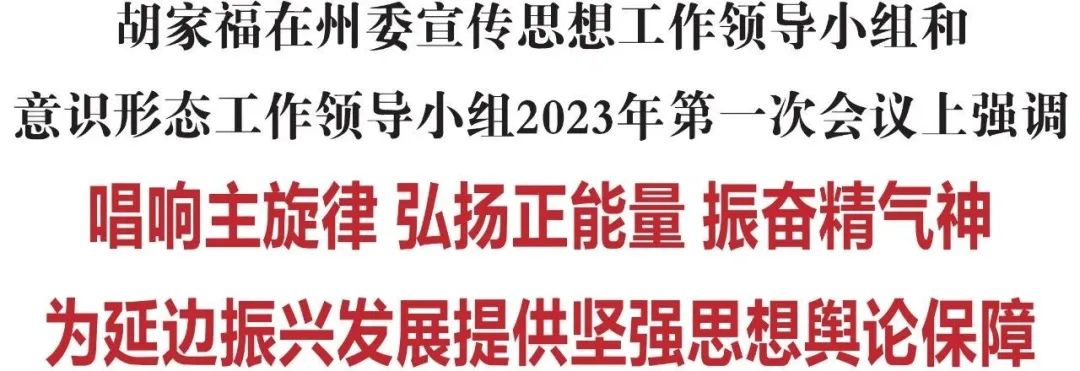 胡家福指出,党的十八大以来,以习近平同志为核心的党中央高度重视宣传思想工作和意识形态工作,习近平总书记发表了一系列重要讲话、作出了一系列重大部署,推动宣传思想工作和意识形态建设取得历史性成就、发生历史性变革。前不久,习近平总书记出席文化传承发展座谈会并发表重要讲话,对中华文化传承发展的一系列重大理论和现实问题进行了深入系统阐述,为我们做好新时代宣传思想和意识形态工作指明了方向、提供了遵循。全州各级各部门要始终牢记“国之大者”,强化问题导向,坚持守正创新,高标准高质量做好宣传思想和意识形态工作。一要加强党的创新理论武装,努力在深化内化转化上取得更好成效。要在学深悟透、宣传普及、转化运用上下功夫,充分发挥“第一议题”制度引领作用,不断提升落实党委(党组)理论学习中心组、党员干部教育培训等制度化规范化实效化水平,积极开展对象化、分众化、互动化宣讲活动,教育引导广大党员深刻领会习近平新时代中国特色社会主义思想的核心要义、精神实质、丰富内涵、实践要求,熟练掌握其中蕴含的领导方法、思想方法、工作方法,真正用党的创新理论武装头脑、指导实践、推动工作。二要主动服务全州工作大局,不断巩固壮大主流思想舆论。进一步扩大正面宣传,加强全媒体传播体系建设,聚焦十大产业集群、“绿美延吉”行动等重点领域,持续向社会传递稳中求进的政策预期和稳定向好的发展预期,大力唱响强信心的社会主旋律,以正能量实现大流量、以大流量澎湃正能量。繁荣发展文化事业,大力实施文艺作品质量提升工程,积极开展“长白天下雪▪吉美在延边”、“延边文化旅游季”等系列主题活动,加快推进延吉文创园等文旅融合项目建设,打造“文旅小屋”、“城市书房”等新型公共文化服务空间,建好用好爱国主义教育基地,进一步擦亮“金达莱文艺志愿服务”、“民间院团走基层”等文化活动品牌,不断提升广大基层群众的文化体验感、获得感和幸福感。三要着力强化风险源头管控,牢牢掌握意识形态工作领导权主动权。密切关注意识形态领域动向,进一步提高对风险隐患的预警、预判、预防能力,严格落实政治家办报、办刊、办台、办网的要求,强化对短视频、自媒体等新业态的监管服务,扎实开展“清朗”系列专项行动,健全完善巡察和检查考核机制,推动意识形态工作长效化、制度化、规范化。各级领导干部要坚决摒弃事不关己、明哲保身等好人主义思想,发扬敢于斗争、善于斗争的精神,对错误思潮、模糊观点敢于说“不”,做到不做“绅士”、敢做“战士”,营造敢于亮剑是尽责、爱惜羽毛是失职的良好政治生态。