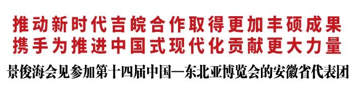 景俊海诚挚欢迎安徽省代表团一行前来参加第十四届中国—东北亚博览会,衷心感谢安徽省长期以来对吉林省经济社会发展的关心支持。景俊海说,这些年,吉林与安徽持续深化交流合作,结下了深厚情谊,取得了扎实成效。当前,吉林省正在深入学习贯彻习近平新时代中国特色社会主义思想,全面实施“一主六双”高质量发展战略,大力发展“六新产业”、建设“四新设施”,加快推动转型数字化、服务智能化、社会共享化、产业高级化。希望双方全面贯彻落实习近平总书记关于区域协调发展的重要论述,认真履行党中央赋予的责任使命,进一步健全交流互访机制,持续加强重点产业和科技创新等领域务实合作,切实把两省深情厚谊延续下去,共同推动新时代吉皖合作取得更加丰硕成果,携手为推进中国式现代化贡献更大力量。