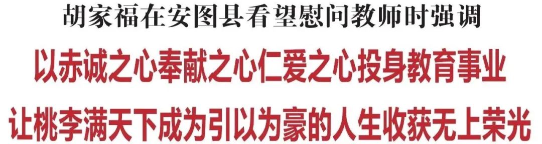 调研期间,胡家福强调,百年大计,教育为本。党的十八大以来,以习近平同志为核心的党中央对教育事业高度重视、对教师队伍寄予殷切期望。长期以来,全州广大教师和教育工作者认真贯彻党的教育方针,静心教书、潜心育人,呕心沥血、默默奉献,为边疆民族地区教育事业发展作出了重要贡献,赢得了全社会的广泛赞誉和普遍尊重。希望大家始终牢记习近平总书记殷殷嘱托,坚定如磐如炬的信仰信念,弘扬至诚至纯的师德师风,涵养精深精湛的学识学问,永葆无私无我的大善大爱,矢志成为有理想信念、有道德情操、有扎实学识、有仁爱之心的“四有”好老师,努力做到“学为人师、行为世范”。全州各级党委政府要始终把教育摆在优先发展位置,满腔热情关心关爱教师,为教师办实事、做好事,充分挖掘“教育文化之乡”的底蕴,大力弘扬尊师重教的社会风尚,进一步增强教师职业荣誉感、成就感和幸福感,更好地激励广大教师为全州教育事业发展、推动延边跨越赶超作出新的更大贡献。