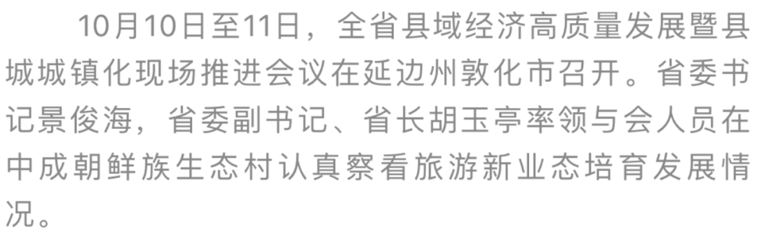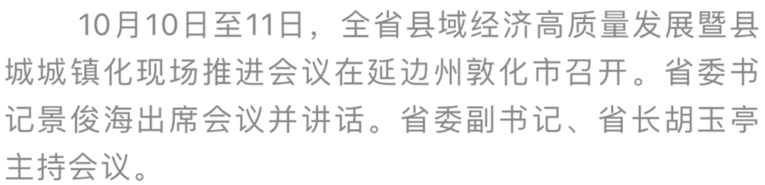 10月10日至11日,全省县域经济高质量发展暨县城城镇化现场推进会议在延边州敦化市召开。省委书记景俊海出席会议并讲话。他强调,要深入贯彻习近平总书记在新时代推动东北全面振兴座谈会上的重要讲话精神,全面落实中办、国办关于推进以县城为重要载体的城镇化建设的意见,聚焦全面实施“一主六双”高质量发展战略,进一步优化生产力布局,持续提升产业承载和人口聚集能力,推动县域发展展现新气象、实现新突破。省委副书记、省长胡玉亭主持会议并讲话。