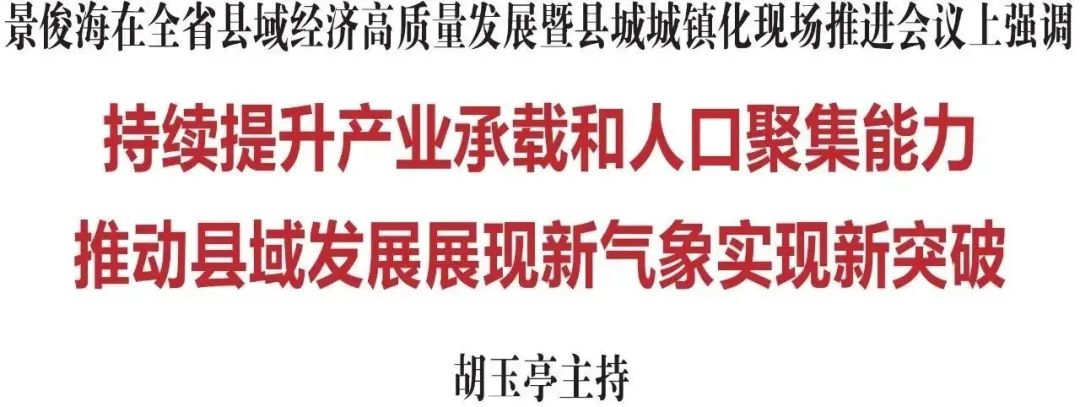 胡玉亭还率领与会人员到敖东工业园、大健康产业园,实地察看项目建设进展,帮助研究解决实际问题。会议播放县域经济高质量发展典型示范专题片。在充分肯定我省县域发展和城镇化工作后,景俊海指出,当前,我省县域发展和新型城镇化进入新阶段,必须准确把握县域发展与维护国家“五大安全”的关系,县域发展与全省高质量发展、可持续振兴的关系,县域发展与新型工业化、信息化、城镇化、农业现代化的关系,县域发展与促进共同富裕的关系,进一步强化县域经济重要支撑作用,充分发挥新型城镇化重要战略优势,持续激发县域发展活力。景俊海强调,推动县域经济高质量发展,要把强县和富民统一起来,把改革和发展结合起来。要以特色优势推动产业现代化,依托特色资源进行全产业链深度开发,因地制宜做强特色工业、壮大特色农业、发展特色服务业。要以项目支撑壮大实体经济,精心抓好项目谋划,提升产业平台功能,强化要素供给保障,更好地聚资源、引客商、招企业、落项目。要以改革放权激发内生动力,最大限度把经济社会管理权限下放到县一级,更好支持新产业新业态新模式发展。要以一流营商环境赋能发展,打造高效便捷政务环境、公正公平法治环境、英才汇聚人才环境,为县域经济高质量发展创造有利条件。景俊海强调,新型城镇化,人是核心、县城是重要载体,关键在城乡融合。要进一步科学把握县城发展定位,加快壮大大城市周边县城,分类打造区域节点特色县城,抓好专业功能型县城培育,更好扶持边境县城发展。要加快完善基础设施,着力实施城市更新行动,扎实推进乡村建设行动,强化城乡道路交通联结。要提升公共服务供给质量,更好满足群众对教育、医疗、社会保障、文化体育等方面需求。要深化体制机制创新,切实打通城乡要素自由流动、平等交换通道。景俊海要求,各级党委政府要把县域发展摆在突出位置,加强组织领导,强化考核评估,搞好试点示范,以“五化”闭环工作法抓好落实,努力营造支持县域发展的浓厚氛围。胡玉亭指出,要切实提高县域经济高质量发展和县城城镇化建设的紧迫感责任感,对照功能定位找准赛道、扬长补短,全力建设一批生态大县、农业强县、工业富县、文旅名县、边境特色县。做强优势主导产业,努力打造产值百亿元以上产业集群。深化扩权强县体制机制改革,盘活用好各类资源。统筹城乡融合发展,加快美丽乡村建设。实施好“县城更新行动”,提高公共服务、人居环境水平。要压实各方责任,坚持统筹在省、推进在市、落地在县,同题共答共考,强化保障支持,鼓励地方首创,“一把手”亲自上手,用数据说话、用结果交账,发挥好考核“指挥棒”作用,推动县域经济高质量发展实现新突破。