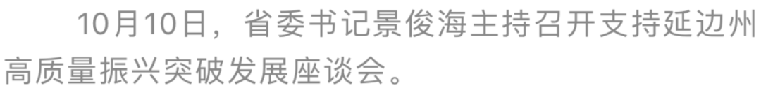 结合开展第二批主题教育,按照省党政领导班子集中深入市(州)开展“察实情、出实招、办实事”活动安排,10月10日,省委书记景俊海率领省党政领导班子到延边,主持召开支持延边州高质量振兴突破发展座谈会,听取情况、了解需求,研究支持发展、解决问题的具体举措。景俊海强调,要深入落实习近平总书记在新时代推动东北全面振兴座谈会上的重要讲话精神,牢记嘱托、坚定信心、实干拼搏,团结带领延边各族干部群众走出富民强州新路。省委副书记、省长胡玉亭出席会议。