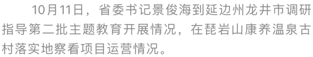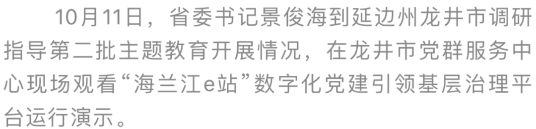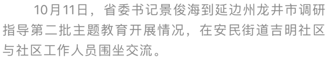 10月11日,省委书记景俊海到延边州龙井市调研指导第二批主题教育开展情况。他强调,要坚持以习近平新时代中国特色社会主义思想为指引,学深悟透习近平总书记在新时代推动东北全面振兴座谈会上的重要讲话精神,深入开展第二批主题教育,全面加强基层党的建设,推动“我为群众办实事”常态化长效化,切实把主题教育成果体现在为民造福实际行动上,持续提升基层党组织领导基层治理能力水平,更好赢得群众对党的信任和拥护。