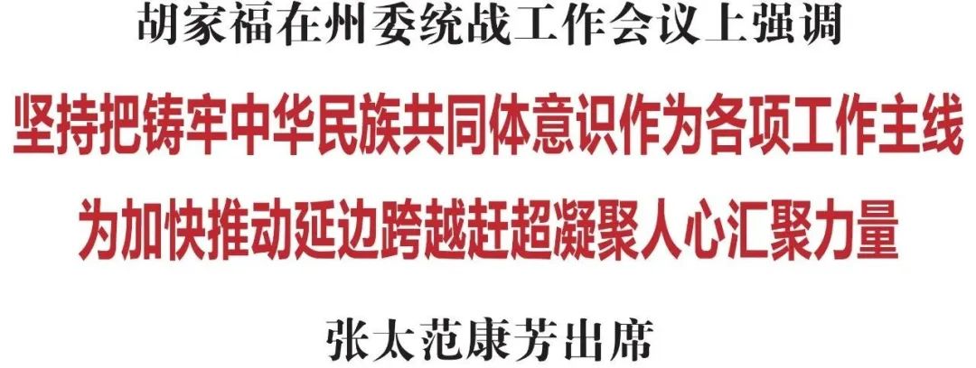 胡家福指出,党的十八大以来,习近平总书记从党和国家事业发展全局和战略高度,围绕做好新时代统一战线工作,创造性提出了统战工作一系列新思想新理念新论断,开辟了马克思主义统一战线理论中国化时代化的新境界。省委统战工作会议就做好新时代吉林统战工作作出具体部署。全州各级党委(党组)要按照中央和省委关于统战工作部署要求,坚持以大团结大联合为主题,坚持以铸牢中华民族共同体意识为主线,坚持以促进民族和睦、宗教和顺、社会和谐为重点,着力做好强信心、聚民心、暖人心、筑同心工作,巩固和发展新时代最广泛的爱国统一战线,不断完善大统战工作格局,更好发挥统一战线强大法宝作用,以高度的政治自觉、强烈的政治担当、坚定的政治行动,奋力开创新时代延边统战事业发展新天地。