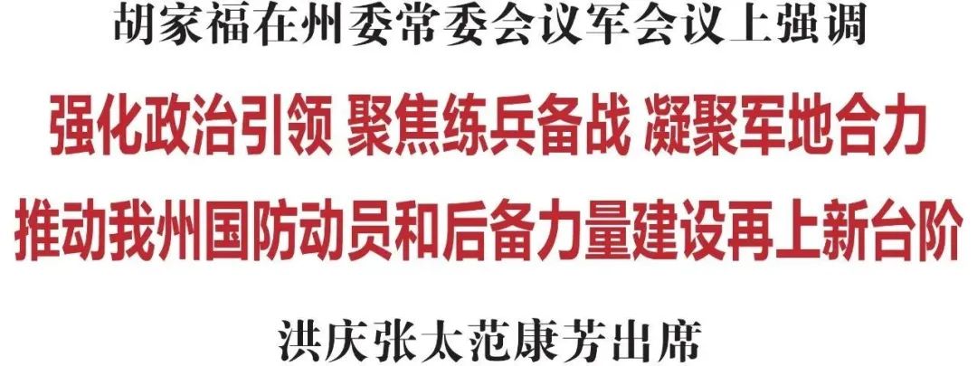 胡家福指出,2023年,全州各级党委政府和军分区部队坚持以习近平新时代中国特色社会主义思想和习近平强军思想为指导,深入贯彻党的二十大精神,认真落实新时代军事战略方针,把牢政治方向抓武装,聚焦应急应战强武装,强化军地合力兴武装,国防动员和后备力量建设迈出坚实步伐。驻延部队广大官兵扎根延边、心系延边、建功延边,积极投身延边经济社会发展,在稳边控边、抢险救援、乡村振兴等重大任务中冲锋在前、作用突出,军民同心续写了坚如磐石的军政军民关系。