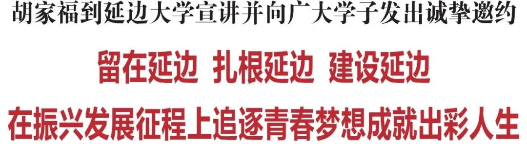 宣讲中,胡家福从五个不同视角向广大学子宣传推介延边,让大家了解延边的精彩魅力,号召大家把延边作为择业就业的首选之地、人生创业的启航之地、奋斗青春的圆梦之地,在加快推动延边跨越赶超火热实践中演绎精彩、创造辉煌、开创未来。