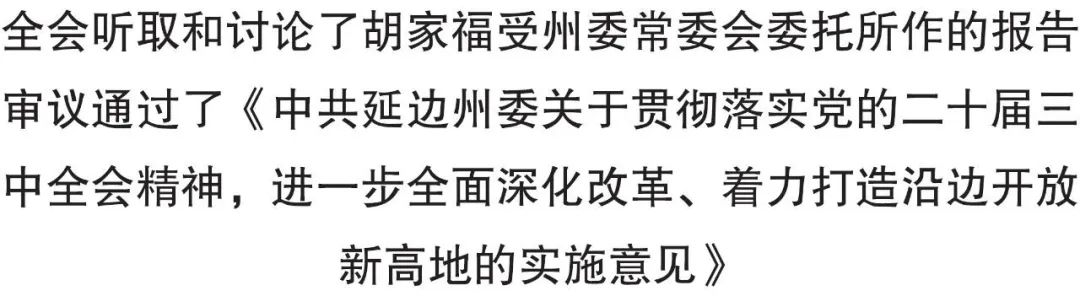 全会指出,党的二十届三中全会是在以中国式现代化全面推进强国建设、民族复兴伟业的关键时期召开的一次十分重要的会议。全会审议通过的《中共中央关于进一步全面深化改革、推进中国式现代化的决定》,擘画了进一步全面深化改革的宏伟蓝图,发出了向改革广度和深度进军的行动号令,既是党的十八届三中全会以来全面深化改革的实践续篇,也是新征程推进中国式现代化的时代新篇,必将为中国式现代化提供强大动力和制度保障。省委十二届五次全会出台《中共吉林省委关于贯彻落实党的二十届三中全会精神、以进一步全面深化改革推动吉林全面振兴取得新突破的实施意见》,提出了一系列具有吉林特色、体现吉林担当的改革举措,把党的二十届三中全会确定的改革宏图变为吉林具体行动。这次州委全会以“进一步全面深化改革、着力打造沿边开放新高地”为主题,紧盯制约延边发展的深层次体制机制障碍,系统谋划了全州进一步全面深化改革的主要任务、重点举措,是对深入贯彻党的二十届三中全会精神和省委十二届五次全会精神的再动员、再部署、再落实,是对中央和省委部署的各项改革任务的细化、实化、具体化,是当前和今后一个时期全州经济社会发展的主要着力点、发力点、突破点。