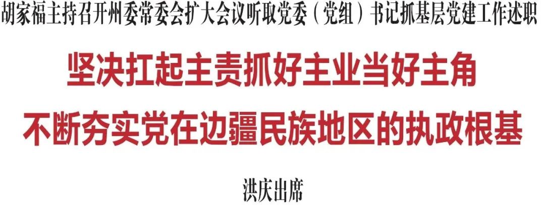 1月18日,省委常委、州委书记胡家福主持召开州委常委会扩大会议,听取各县(市)和州直有关党委、党工委、党组书记抓基层党建工作述职。他强调,要深入学习贯彻习近平总书记关于党的建设的重要思想,认真落实新时代党的建设总要求和新时代党的组织路线,坚决扛起主责、抓好主业、当好主角,坚持不懈抓基层、强基础、固基本,进一步增强基层党组织政治功能和组织功能,不断夯实党在边疆民族地区的执政根基。州委副书记、州长洪庆出席会议。