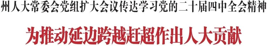 10月30日,州人大常委会党组书记、主任蔡红星主持召开党组扩大会议,传达学习党的二十届四中全会精神,要求全州各级人大常委会按照省、州委部署,深刻理解、准确把握全会精神的核心要义、精神实质、丰富内涵和实践要求,坚定自觉地把思想和行动统一到党中央决策部署上来,以奋发有为的精神状态和求真务实的作风,为推动延边跨越赶超迈出坚实步伐、加快走出一条具有延边特色的高质量发展新路、确保与全国同步基本实现社会主义现代化取得决定性进展作出人大贡献。