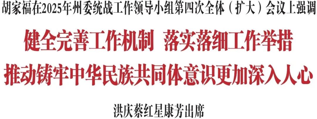 11月25日,省委常委、州委书记、州委统战工作领导小组组长胡家福主持召开2025年州委统战工作领导小组第四次全体(扩大)会议。他强调,要深入贯彻习近平总书记关于加强和改进民族工作的重要思想、关于铸牢中华民族共同体意识的重要论述,准确把握新时代党的民族工作新的阶段性特征,健全完善工作机制,落实落细工作举措,推动铸牢中华民族共同体意识更加深入人心。州委副书记、州长洪庆,州人大常委会主任蔡红星,州政协主席康芳出席会议。