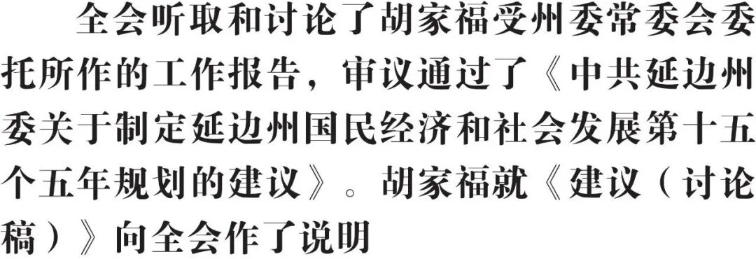 全会以习近平新时代中国特色社会主义思想为指导,深入学习贯彻党的二十届四中全会精神,认真落实省委十二届八次全会精神,听取和讨论了胡家福受州委常委会委托所作的工作报告,审议通过了《中共延边州委关于制定延边州国民经济和社会发展第十五个五年规划的建议》。胡家福就《建议(讨论稿)》向全会作了说明。