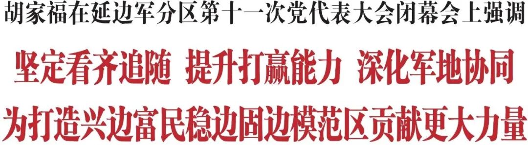 12月25日,延边军分区第十一次党代表大会在延吉闭幕。省委常委、州委书记、延边军分区党委第一书记胡家福出席闭幕会并讲话。他强调,要深入贯彻习近平强军思想和党的二十届四中全会精神,认真落实新时代军事战略方针,坚定看齐追随,提升打赢能力,深化军地协同,为打造兴边富民稳边固边模范区贡献更大力量。