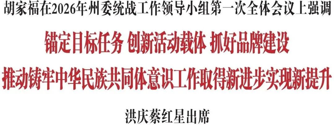 1月4日,元旦后上班第一天,省委常委、州委书记、州委统战工作领导小组组长胡家福主持召开2026年州委统战工作领导小组第一次全体会议。他强调,要深入贯彻习近平总书记关于加强和改进民族工作的重要思想特别是关于铸牢中华民族共同体意识的重要论述,锚定“打造新时代民族团结进步示范区”目标任务,创新活动载体,抓好品牌建设,推动铸牢中华民族共同体意识工作取得新进步、实现新提升。州委副书记、州长洪庆,州人大常委会主任蔡红星出席会议。