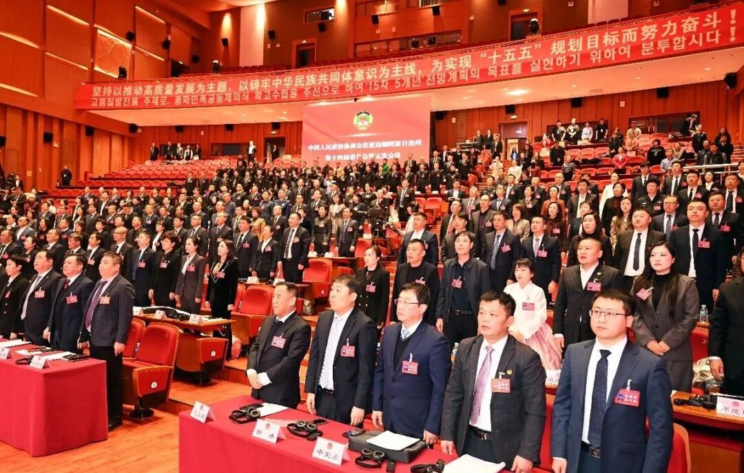 会场气氛庄重而热烈。二楼眺台上,“坚持以推动高质量发展为主题,以铸牢中华民族共同体意识为主线,为实现‘十五五’规划目标而努力奋斗!”的横幅标语格外醒目;主席台上,中国人民政治协商会议会徽悬挂在正中央,十面鲜艳的红旗分列两侧。