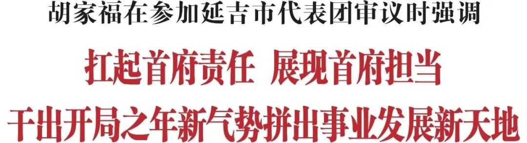 1月21日,省委常委、州委书记胡家福到延吉市代表团参加审议。他强调,延吉市要扛起首府责任,展现首府担当,干出开局之年新气势,拼出事业发展新天地,为加快推动延边跨越赶超作出更大贡献。