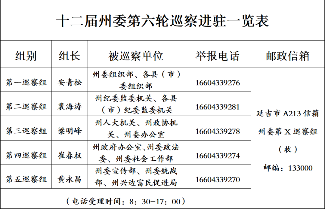 巡察期间,各州委巡察组设立专门举报电话和邮政信箱,主要受理反映被巡察单位领导班子及其成员、下一级党组织主要负责人和重点岗位人员问题的来电、来信、来访,重点是关于违反政治纪律、组织纪律、廉洁纪律、群众纪律、工作纪律、生活纪律等方面的举报和反映。受理信访时间截止到2026年5月8日。