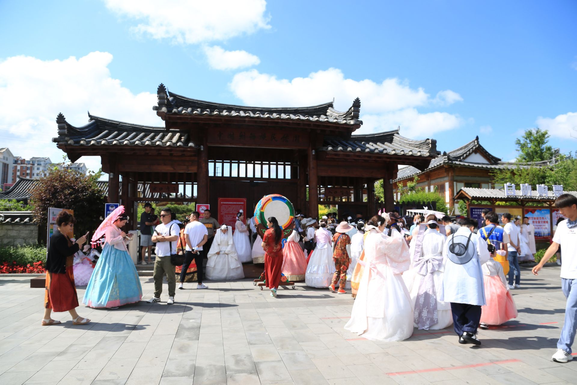 中国朝鲜族民俗园作为一处火爆的网红打卡地,做好文明礼仪接待工作是重中之重。今年暑假期间,民俗园平均每天接待游客约1.5万人,40余名工作人员几乎全年无休。每逢周末和节日期间的入园仪式、节目表演都把氛围感拉满。游客服务中心每天都会接到游客求助,工作人员都耐心细致地帮忙解决问题,面对寻物、寻人等,园区会通过广播及摄影师微信群发布信息进行寻找。