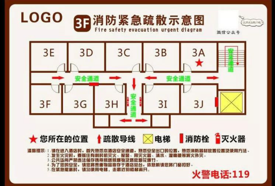 在宾馆客房门的背后或走廊里,一般都有安全疏散示意图,标明房间或你当前所在位置以及安全出口位置,同时会用箭头指明疏散方向。