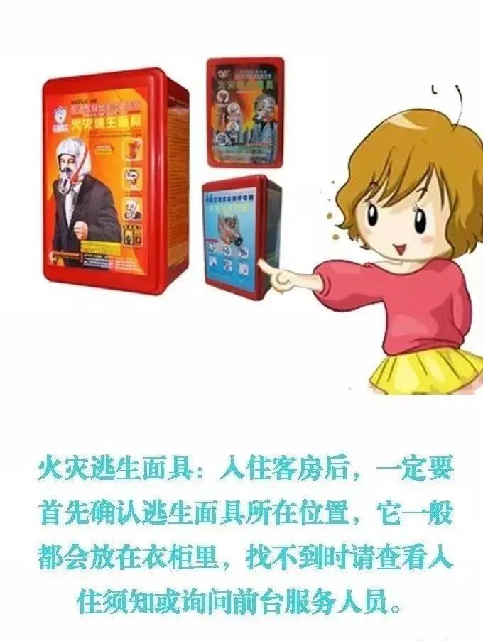 住酒店还应该了解的消防标识、器材,你要找到它们在哪儿,知道它们的作用,才能在发生危险时顺利逃生。
