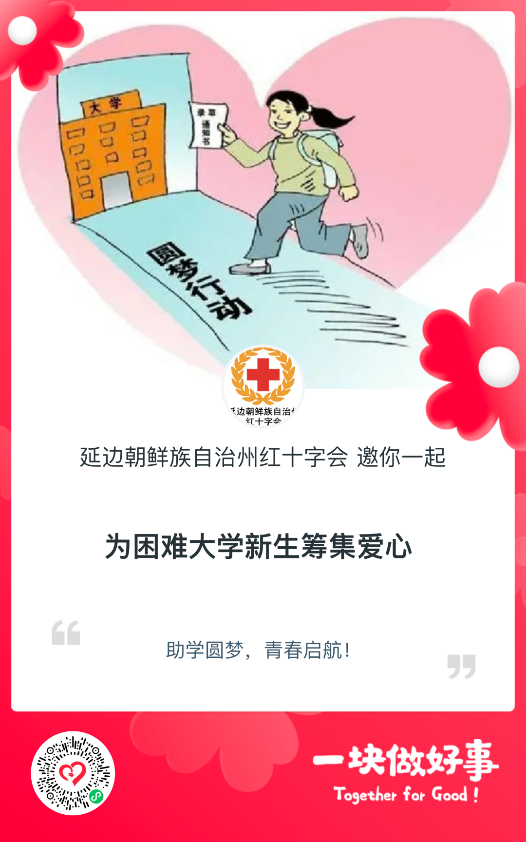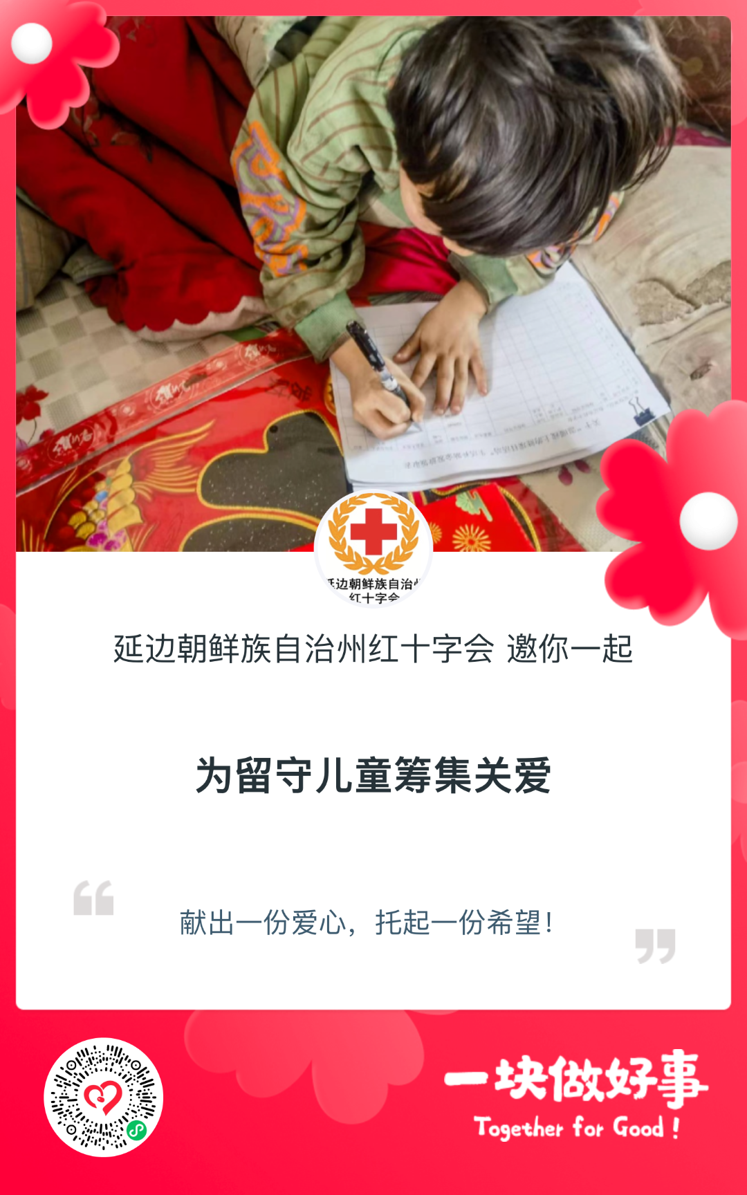 2024年是中国红十字会成立120周年。为大力弘扬“人道、博爱、奉献”的红十字精神,在第77个“世界红十字日”来临之际,围绕“人道精神 生生不息”的主题,延边州红十字会组织开展“5·8人道公益日”募捐活动,发布了“关注留守儿童计划”“爱心助力共圆求学梦”“应急救护一体机”“边境村博爱家园”四个公益项目,旨在聚小善、成大爱,为困难群众排忧解难,让困难群众更多更公平地享受到经济社会发展成果,用实际行动为社会增添更多温暖和力量!
