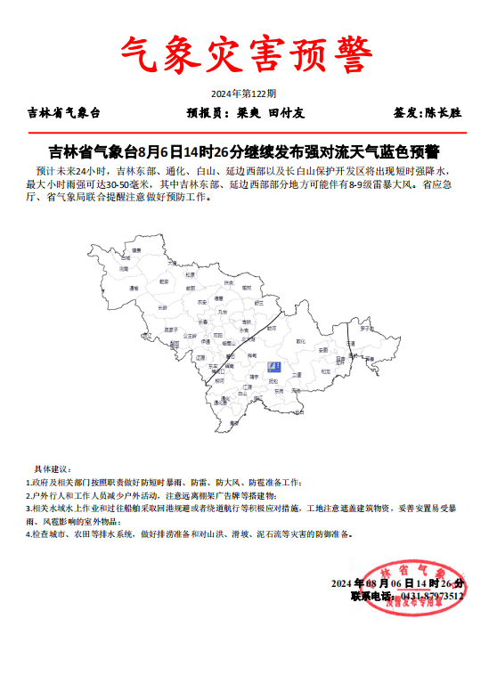 吉林省气象台8月6日14时26分继续发布强对流天气蓝色预警:预计未来24小时,吉林东部、通化、白山、延边西部以及长白山保护开发区将出现短时强降水,最大小时雨强可达30-50毫米,其中吉林东部、延边西部部分地方可能伴有8-9级雷暴大风。省应急厅、省气象局联合提醒注意做好预防工作。