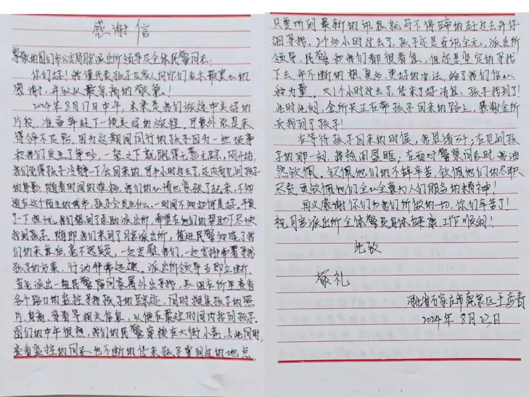 见到儿子平安无事,王先生悬着的一颗心终于放了下来。他紧紧牵着儿子,向派出所的民警连连道谢。旅游结束回到家中后,第一时间便写了一封感谢信邮寄给派出所表达其深深的感激之情。