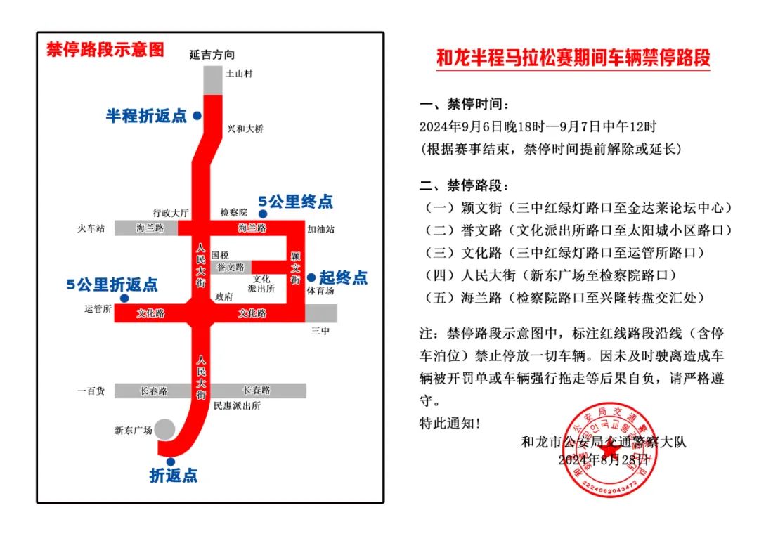 和龙市将于2024年9月7日举办“成长杯”中国·吉林边境森林马拉松系列赛。为确保比赛安全、有序进行,根据《中华人民共和国道路交通安全法》有关规定,决定对和龙市部分道路实行交通管制。