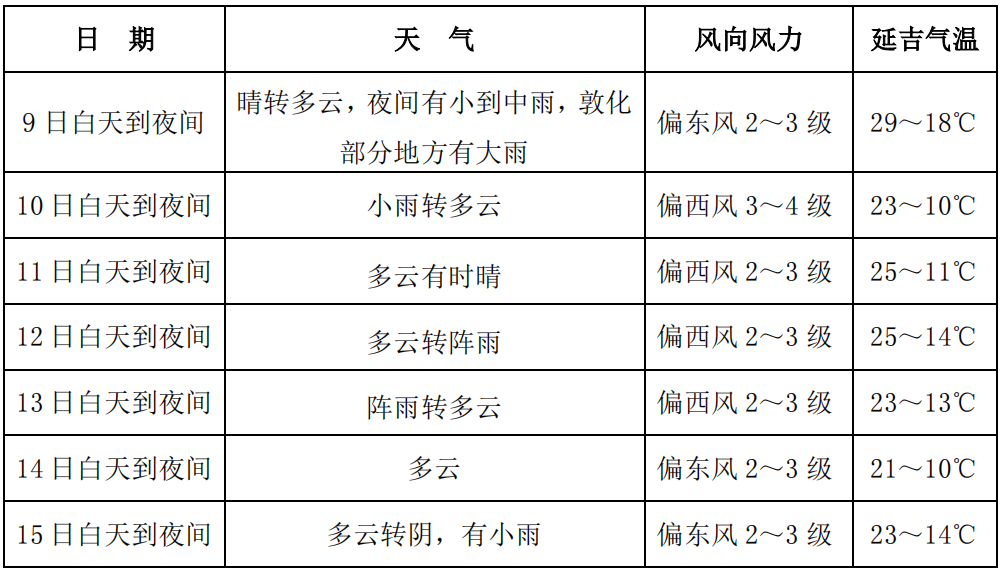 1.9日夜间到10日白天,有小到中雨,敦化部分地方有大雨;