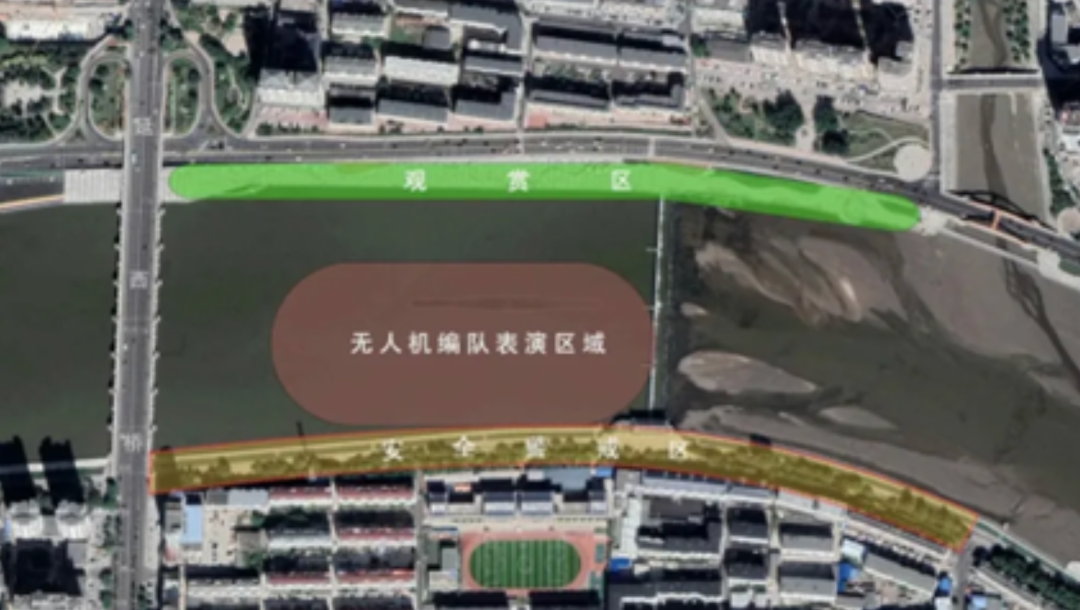 此次无人机表演设置了观赏区、表演区、警戒区,警戒区域内禁止一切人员和车辆出入。具体划定范围区域如下图: