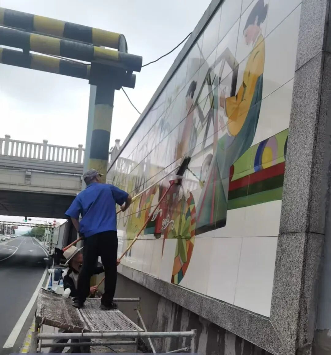 延吉大桥下文化墙也完成升级改造,成为守护城市记忆的“新名片”。此次改造遵循“保留文化根脉、提升环境品质”原则,施工人员先对550平方米壁画全面清洗去尘,再对23平方米剥落部位精准填补;针对墙体底部蘑菇石破损问题,用真石漆对530平方米区域统一升级,既消除安全隐患,又让文化墙与桥体环境相得益彰。项目累计投入80余人次,10天高效完工,生动践行“见缝插绿、提质增颜”理念。