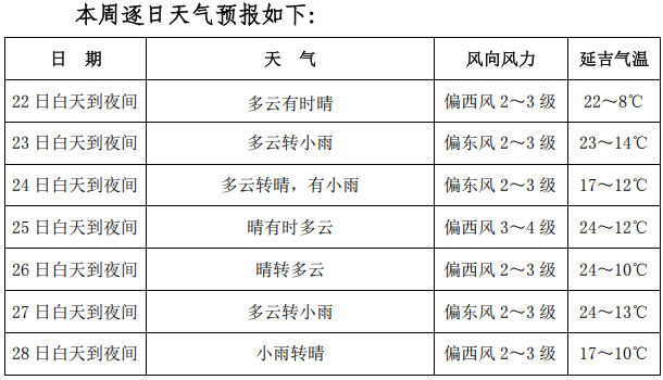 预计全州平均气温为15.0℃左右,与常年同期相比高2.3℃左右。本周气温总体偏高,但24日、28日气温较低,最高气温一般为17℃~20℃。全州平均降水量为8毫米~13毫米,与常年同期相近。预计23日夜间到24日白天有小雨;27日夜间到28日白天有小雨或雷阵雨。