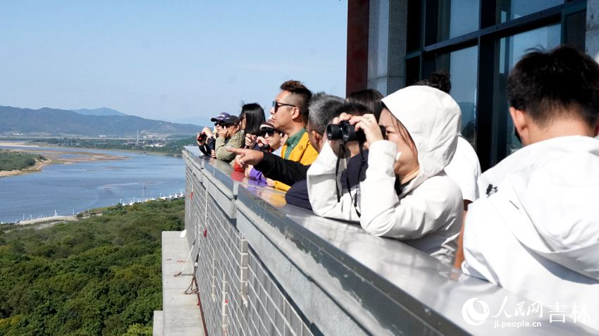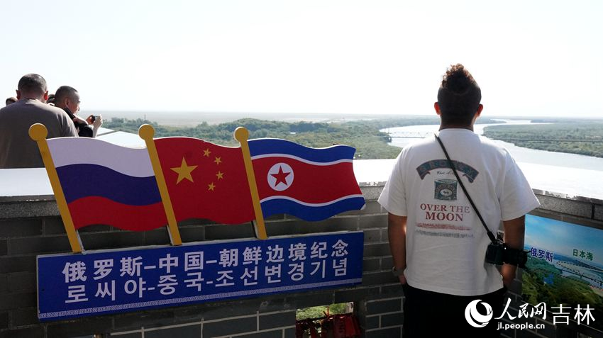 在防川景区,达人们登上龙虎阁远眺,一览中朝俄三国景色。浓密的树林、缓缓流过的图们江、更远处湖泊沼泽的濒海平原,以及那雾气蒙蒙的日本海,与天际相连。