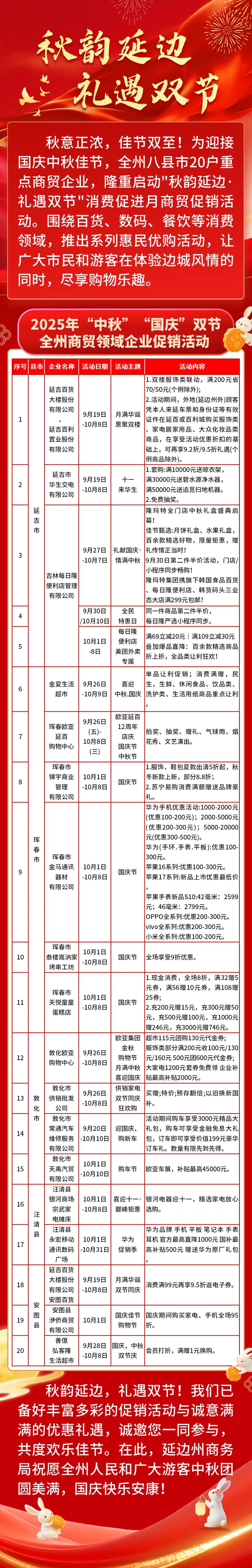 2025“秋韵延边·礼遇双节”消费促进月∣诚意满满,“惠”等你来,20户商贸企业联动惠民