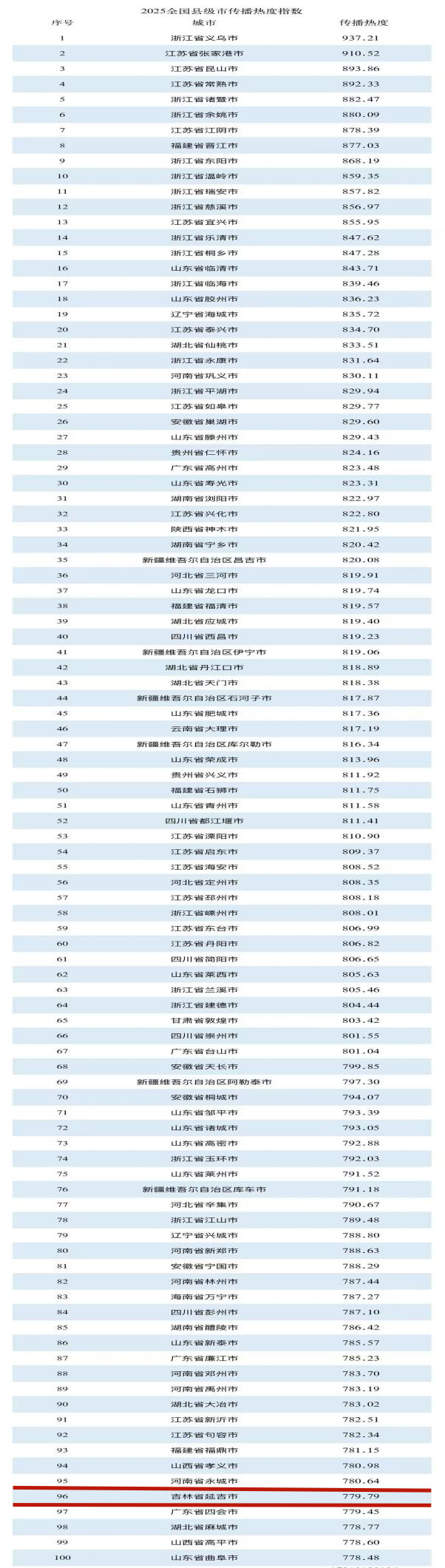 近日,人民日报社所属中国城市报社、中国城市品牌研究院在国家市场监管总局、国家标准委等部委以及中国报业协会、中国传媒大学支持下,根据中国数字产业品牌集群和微热点研究院数据及相关标准,对全国397个县级市2024年8月19日至2025年8月18日期间有关数据进行标准化分析,发布全国县级市传播指数排名前100名单。延吉市是吉林省唯一入围县级市榜单的城市,位列第96位!