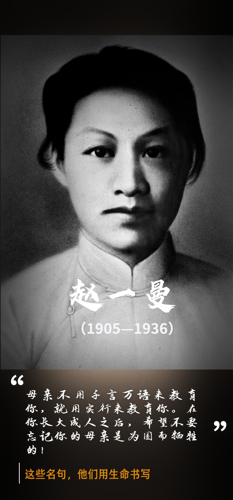 1936年8月2日凌晨,赵一曼被押上去珠河的火车。她知道最后的时刻到了。在这最后的时刻,她给心爱的儿子写下遗书:“宁儿啊!赶快成人,来安慰你地下的母亲!我最亲爱的孩子啊!母亲不用千言万语来教育你,就用实行来教育你。在你长大成人之后,希望不要忘记你的母亲是为国牺牲的!”