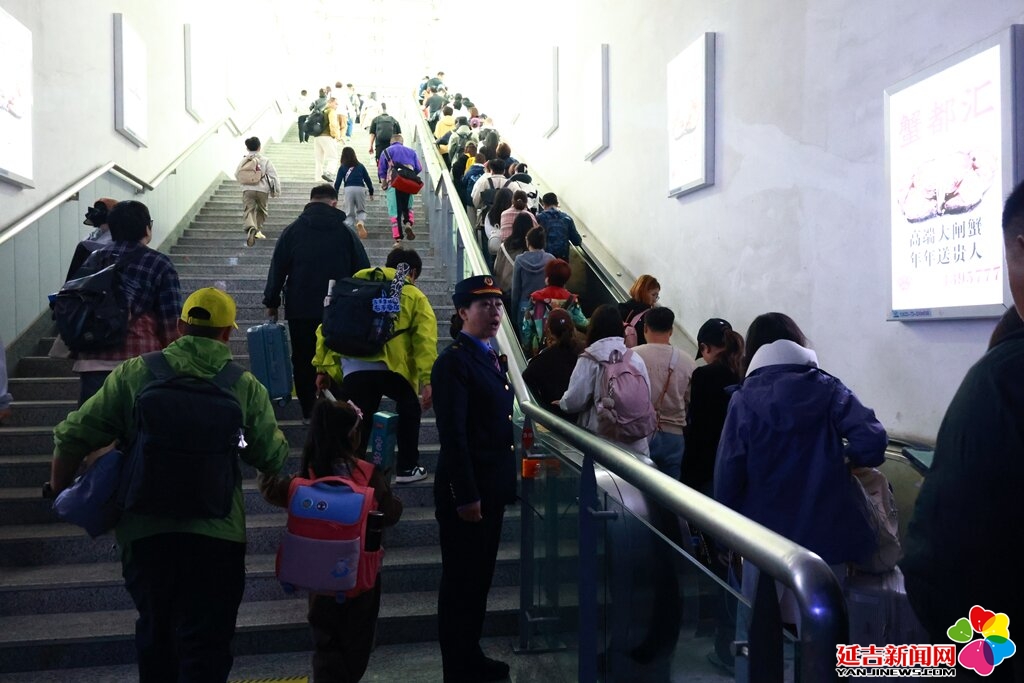 节日期间,延吉作为旅游热门城市,吸引八方游客前来尝美食赏美景。为高效缓解客流压力,该站主动优化服务流程,全面开放所有安检通道,安排专人引导控流,有效缩短旅客排队等候时间。同时,在售票大厅安排“金达莱之约”服务团队,重点关注老年旅客需求,提供“一对一”购票指导与操作帮扶,切实解决老年群体“不会用、不敢用”智能设备的出行困扰。该站还聚焦扶梯出入口、站台狭窄段、安检通道等易拥堵关键区域,组建“服务先锋队”,推行“定点值守+流动巡查”双重保障机制,每天安排人员在扶梯旁、站台窄处引导,耐心提醒旅客站稳扶好、有序通行,有效避免人群拥挤滞留,为旅客出行安全筑起坚实“防护墙”。