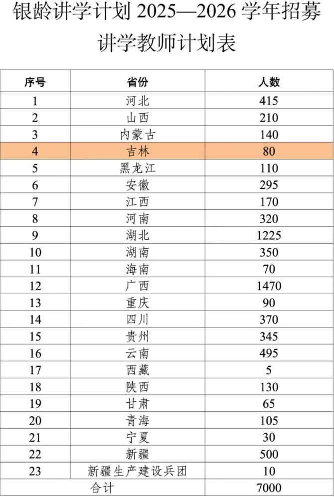 近日,教育部、财政部发布关于做好2025年银龄讲学计划有关实施工作的通知,计划在2025年义务教育阶段招募7000名讲学教师,旨在充分利用退休教师专业优势、经验优势,加强新时代乡村教师队伍建设,推动巩固拓展脱贫攻坚成果同乡村振兴有效衔接。其中,吉林省将招募80名。