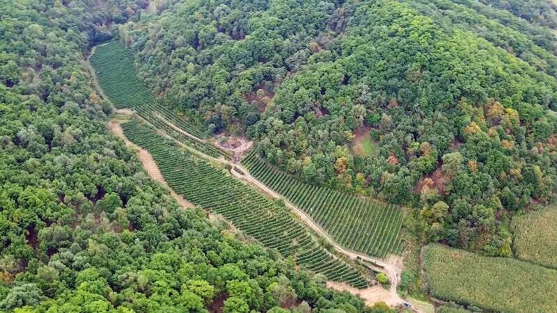 秋日里,安图县亮兵镇会财村色彩斑斓,一株株藤蔓沿着水泥桩蜿蜒攀升,一排排连成一片,远远望去,如同为田野织就了一层绿绸;缀满其间的五味子,则是这绸面上最亮眼的“红宝石”。