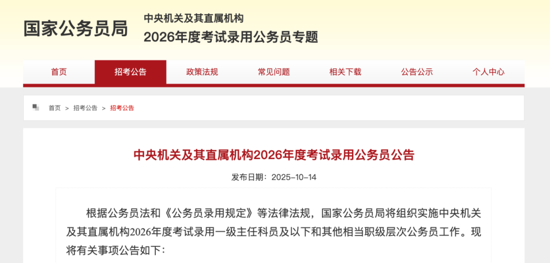 2026年度考试录用公务员公告